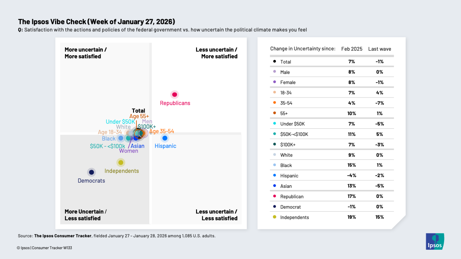 With everything going on in the U.S. these days, and COVID-early-days levels of uncertainty, we started a module in the Ipsos Consumer Tracker called the Ipsos Vibe Check. It asks a two-part question: How uncertain are you feeling about the impacts of the actions of the government and how satisfied do you feel?
