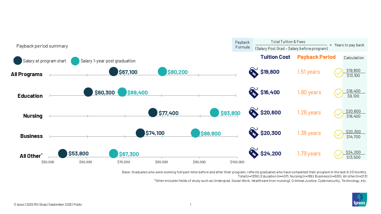 - Education: 1-year salary increase of 15%; ability to pay back tuition in 1.80 years