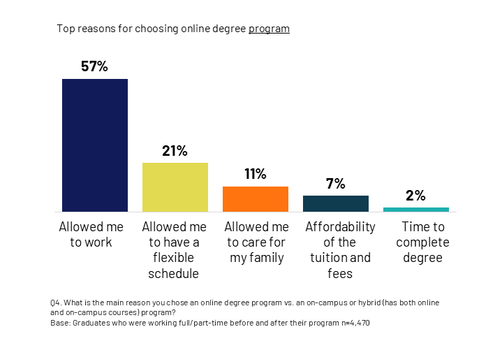 The ability to continue working was, by far, the top reason for choosing online over on-campus degree programs (57%). Fully 90% of graduates were able to work full-time during their program, while the remainder report either part-time employment or a mix of the two, enabling them to bring in much-needed income while pursuing their degree. Another 92% agree that, because of their online degree, they were able to continue living and working in their local communities – something seen as “extremely important” by 65% of graduates.