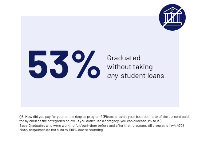 The conversation surrounding student debt and loans is far from over, remaining a complex issue with significant economic implications for students. It is especially noteworthy that a majority (53%) of graduates of Risepoint-supported programs did not take on any student debt. In fact, loans make up less than half of degree program funding (40%). Often, graduates of Risepoint-supported programs are able to leverage their own income or savings (35%) and employer tuition assistance (15%) to fund their degrees.