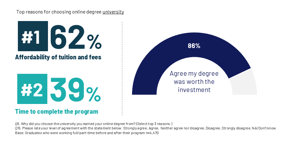 Salary increases, the ability to continue working while earning one’s degree, and a relatively low debt burden post-degree add up to high satisfaction levels among graduates of Risepoint-supported programs. Affordability (62%) and length of time required to complete the degree program (39%) are paramount in graduates’ decisions to go with their chosen universities. Overwhelmingly (86%), graduates see their investment as being worthwhile.