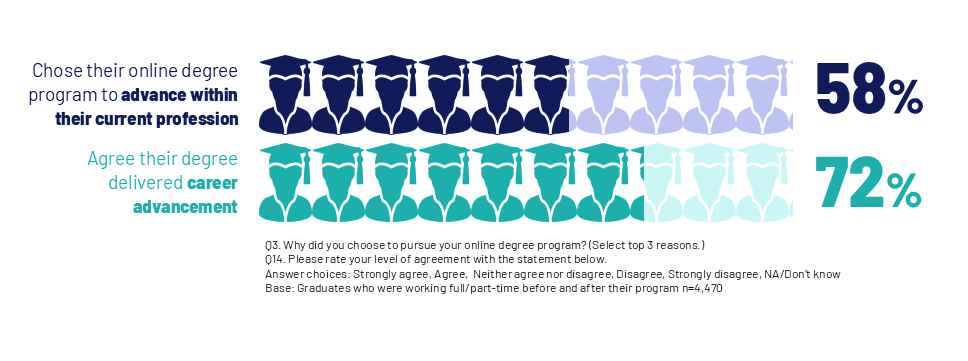 Meanwhile, the appeal of Risepoint-supported degree programs goes beyond dollars and cents and calendar months. Professional development and career growth are key factors to graduates when deciding on a degree program. Six in 10 (58%) report choosing their online degree program for potential career advancement opportunities. Even more – seven in 10 (72%) – agree that their degree helped them advance in their career.