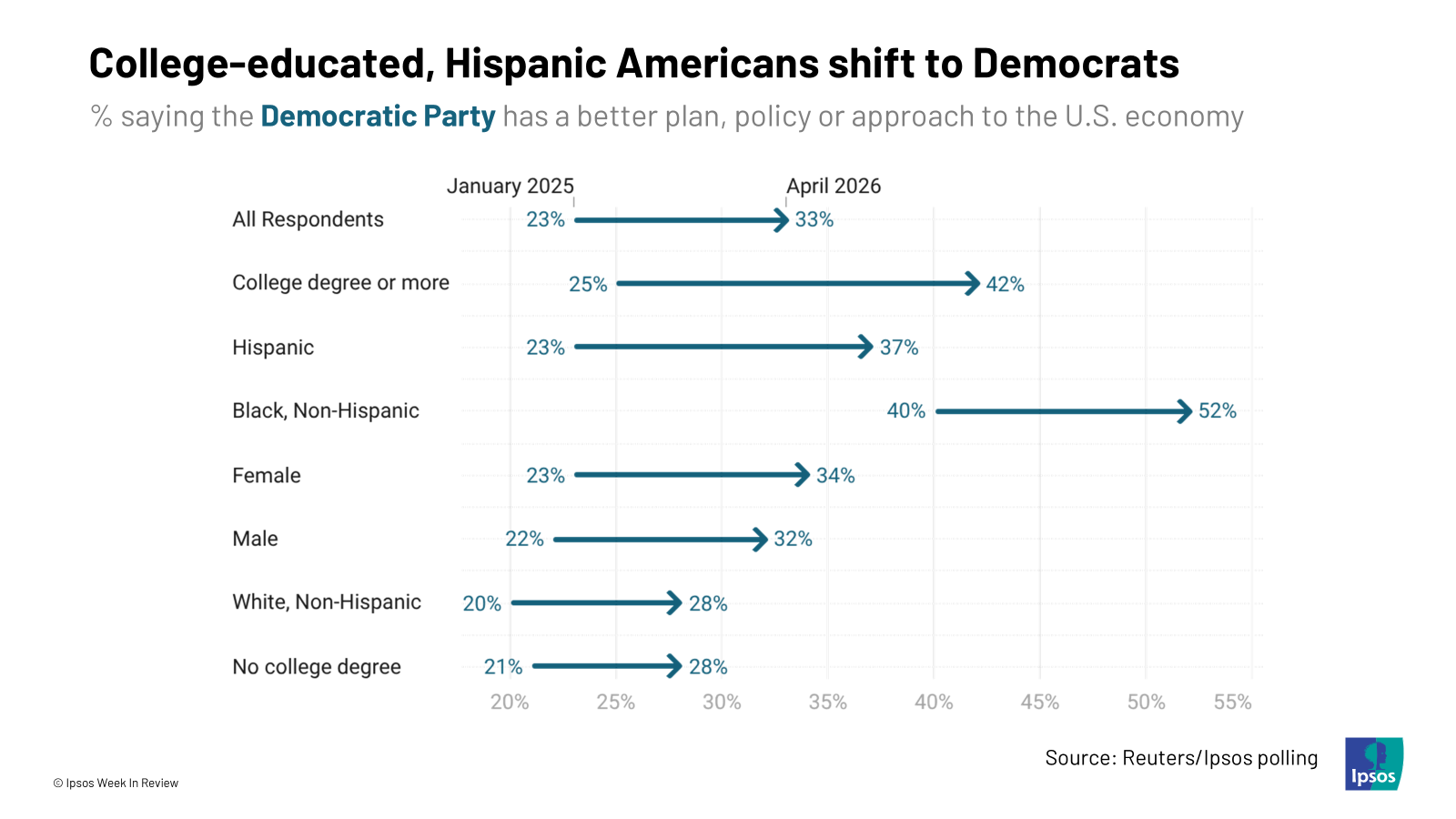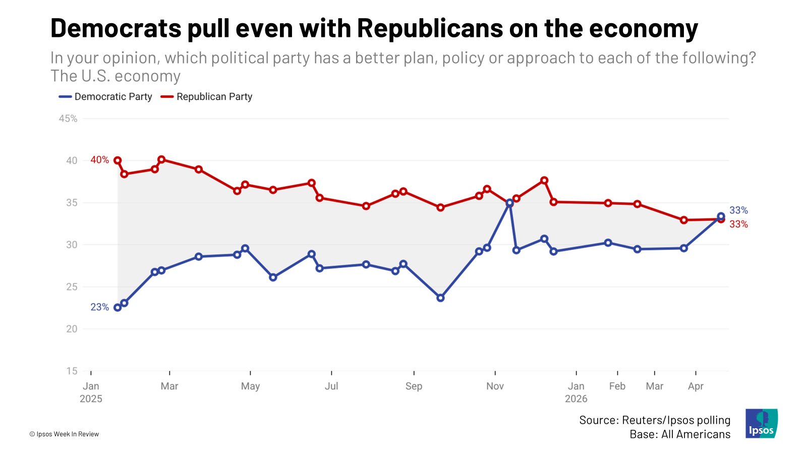 Now, as the war in Iran continues to affect the global economy, the latest Reuters/Ipsos polling shows that Democrats have pulled even on the economy, marking a dramatic 17-point shift in less than a year and a half.