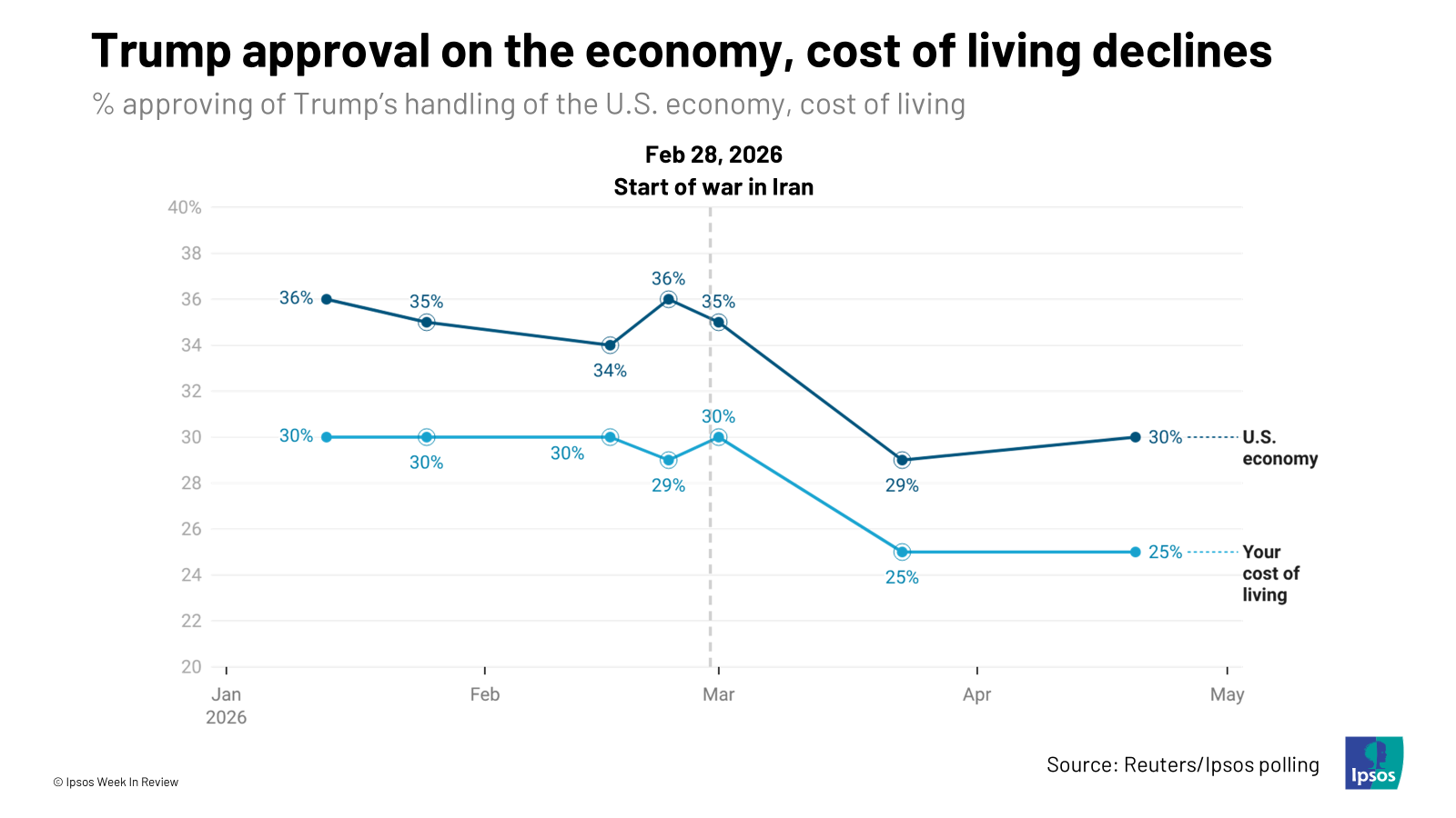 3. Trump loses ground on the economy, cost of living. As the Iran war continues to weigh on household budgets, Americans are increasingly disapproving of the President's handling of the economy and cost of living.