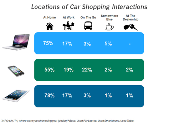 It is also interesting to note that consumers aren't necessarily going to the dealerships to `kick the tires' anymore. They can now tap into a wealth of data and customer reviews, so there's little need to research during in-person dealer visits. In fact, only 2% of car shoppers used their smartphones and 1% used their tablets at the dealership, indicating that virtually all of online car shopping interactions occur outside of the dealership.