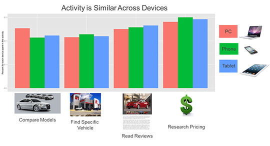 In our study, we found that shopping activity remains fairly consistent across devices. While PCs lead as the device of choice when comparing models (likely due to the larger screen), tablets are most popular for reading reviews, and smartphones are best used for finding a specific vehicle and researching pricing.