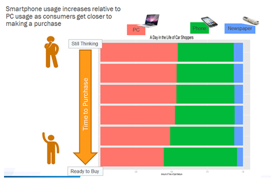 The chart below looks at a day in the life of car shoppers. Overall, we see that smartphone usage increases relative to PC usage as consumers get closer to making a purchase.