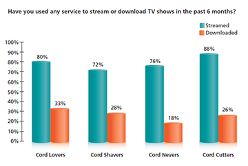 Finally, electronic sell-through, or paying to download shows via iTunes or Amazon Instant Video, is not a cord cutting behavior. Rather, Cord Lovers are significantly more likely than Cord Shavers, Cord Cutters and Cord Nevers to download or stream via iTunes, which implies that Cord Lovers really do appreciate TV content and that the use of iTunes to watch TV shows is a supplementary rather than replacement viewing behavior.
