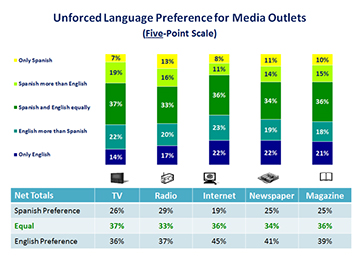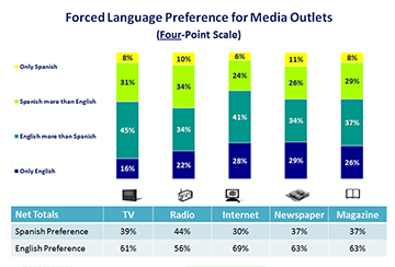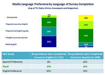 These findings translate into two key implications for researchers and marketers. The first is that, whenever possible, language preference for media consumption should be asked systematically when conducting research among this audience. Furthermore, that any question referring to language of preference for media consumption should avoid forcing respondents to choose one language over the other; a mid-point option of equal preference or no preference should be included.