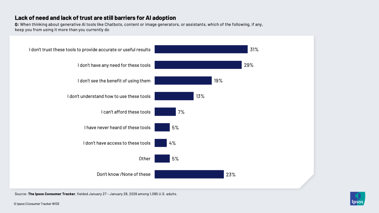 What we found: Lack of trust in the results and lack of need or perceived benefits are the main reasons people cite for not using AI more. Lack of understanding is further behind, and lack of affordability and access are cited by just single digits. Note that in the verbatim responses were several comments about the environmental effects of AI usage, which we’ll try to capture more formally the next time we ask this question.