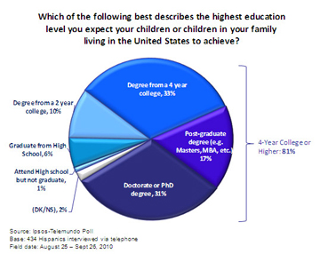In fact, most Hispanics (81%) expect for their children or children in their family living in the U.S. to achieve at least a degree from a four-year college, including almost half (48%) who expect that they will achieve an advance degree such as a Master's or an MBA (17%) or even go all the way to attain a doctorate or a PhD (31%).