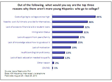 While Hispanics living in the U.S. overwhelmingly appreciate the importance of education and hope for their children at least to graduate from college, the reality is that Hispanics are less likely to go to college than are young adults from other ethnicities. With this in mind, survey respondents were asked to select the three top reasons which, in their mind, prevent more young Hispanics from attending college.