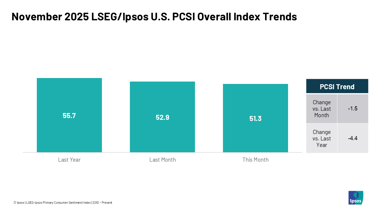 Washington DC, November 14, 2025--The LSEG/Ipsos Primary Consumer Sentiment Index for November 2025 is at 51.3. Fielded from October 24 – 31, 2025, the Index is down 1.5 points from last month.