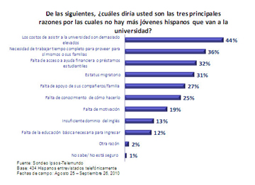 Si bien los Hispanos que viven en los EE.UU. valoran la importancia de la educaciуn y tienen la esperanza que sus hijos por lo menos se gradъen de la universidad, la realidad es que los jуvenes Hispanos tienen menor probabilidad de asistir a la universidad que otros jуvenes. Con esto en mente, se pidiу a los encuestados que seleccionaran las tres principales razones que, en su mente, impiden que mбs jуvenes Hispanos asistan a la universidad.