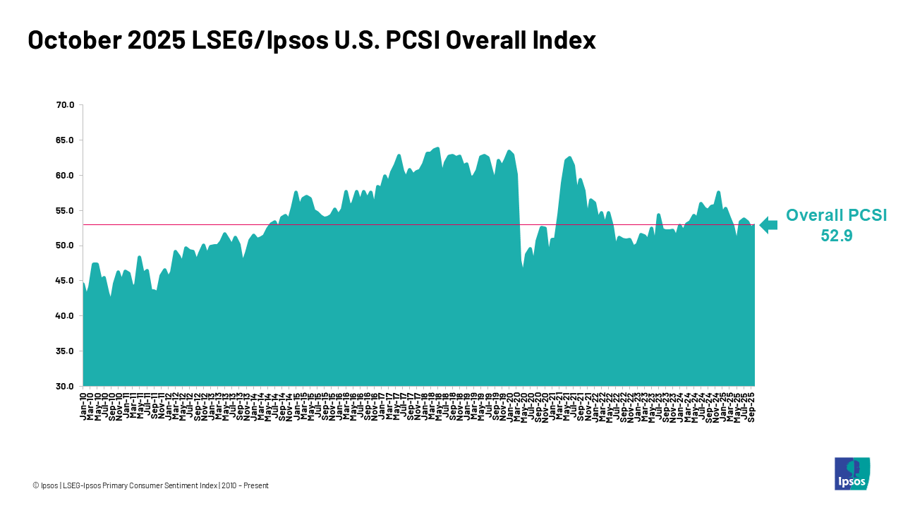 Washington DC, October 10, 2025--The LSEG/Ipsos Primary Consumer Sentiment Index for October 2025 is at 52.9. Fielded from September 19 – 25, 2025*, the Index is up 0.5 point from last month.