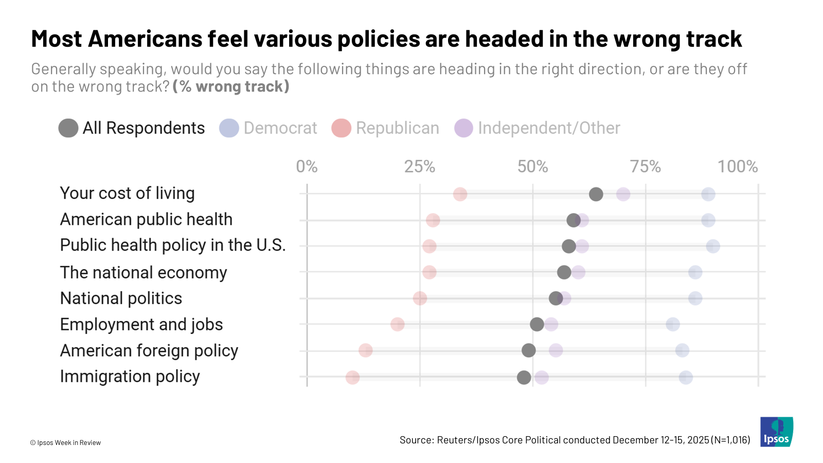 - On the wrong track. Of course, political affiliation plays a large influence on attitudes towards the direction of national policies; Republicans are unsurprisingly more likely to feel these areas are headed in the right direction. But altogether, the data paint a picture of an American public disgruntled by the state of national affairs.