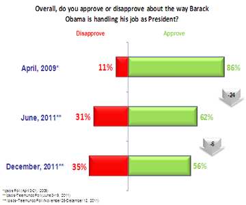While President Obama's approval ratings among Hispanics continue to be higher than among the U.S public at large (56% vs. 47%), the gap between both audiences narrowed by three percentage points since June 2011 (62% vs. 50%, respectively), and by 14 percentage points when compared to April 2009 (86% vs. 63%). The gap between Hispanics who approve of President Obama, and adults from the general public who do so, has reduced from 23 points in April 2009, to 12 points in June 2011, to just nine points in December, 2011. These results suggest that while President Obama's approval has been dropping since he took office, the disillusion among Hispanics is more pronounced than among the general public.