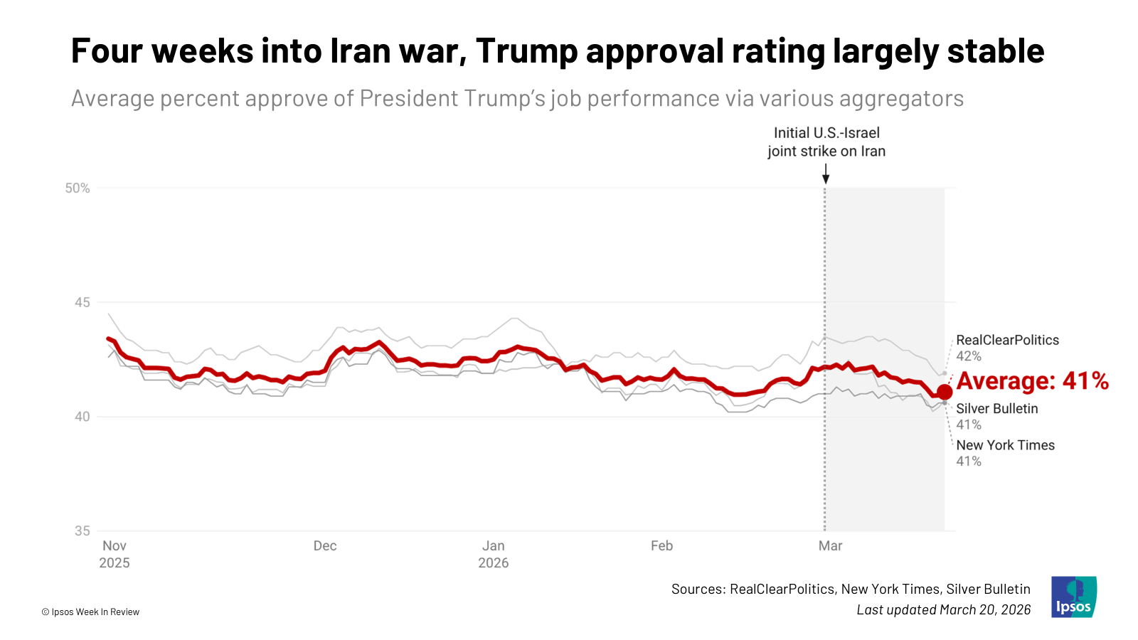 Below are five charts on where Trump’s approval rating stands, why Trump’s approval rating has been so stable, and where Trump’s supporters stand on the war.