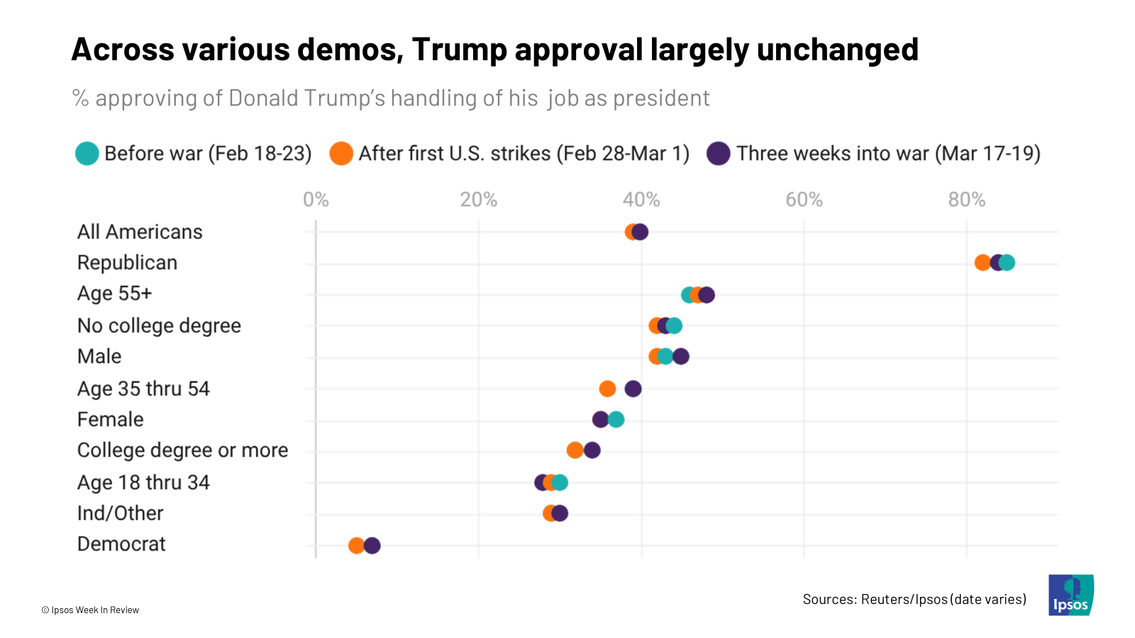 2. This holds across various demographics. Looking at three different Reuters/Ipsos polls – one conducted before the war, one conducted immediately after the first U.S. strikes, and one conducted around three weeks into the war – there has been no significant movement among various demographic groups, either for or against Trump.