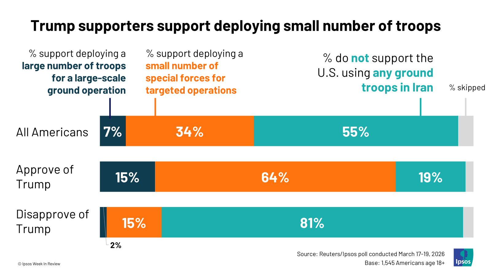 4. Would the deployment of ground troops affect Trump’s approval rating? Opposition to using ground troops in Iran largely comes from those who already disapprove of Trump. But there is a sizable minority (roughly a fifth) of Trump supporters who oppose any ground troops in Iran. If troops are deployed, Trump may lose some support on the edges, although it likely wouldn’t be a major blow – a majority of Trump’s base currently supports deploying a small number of troops.