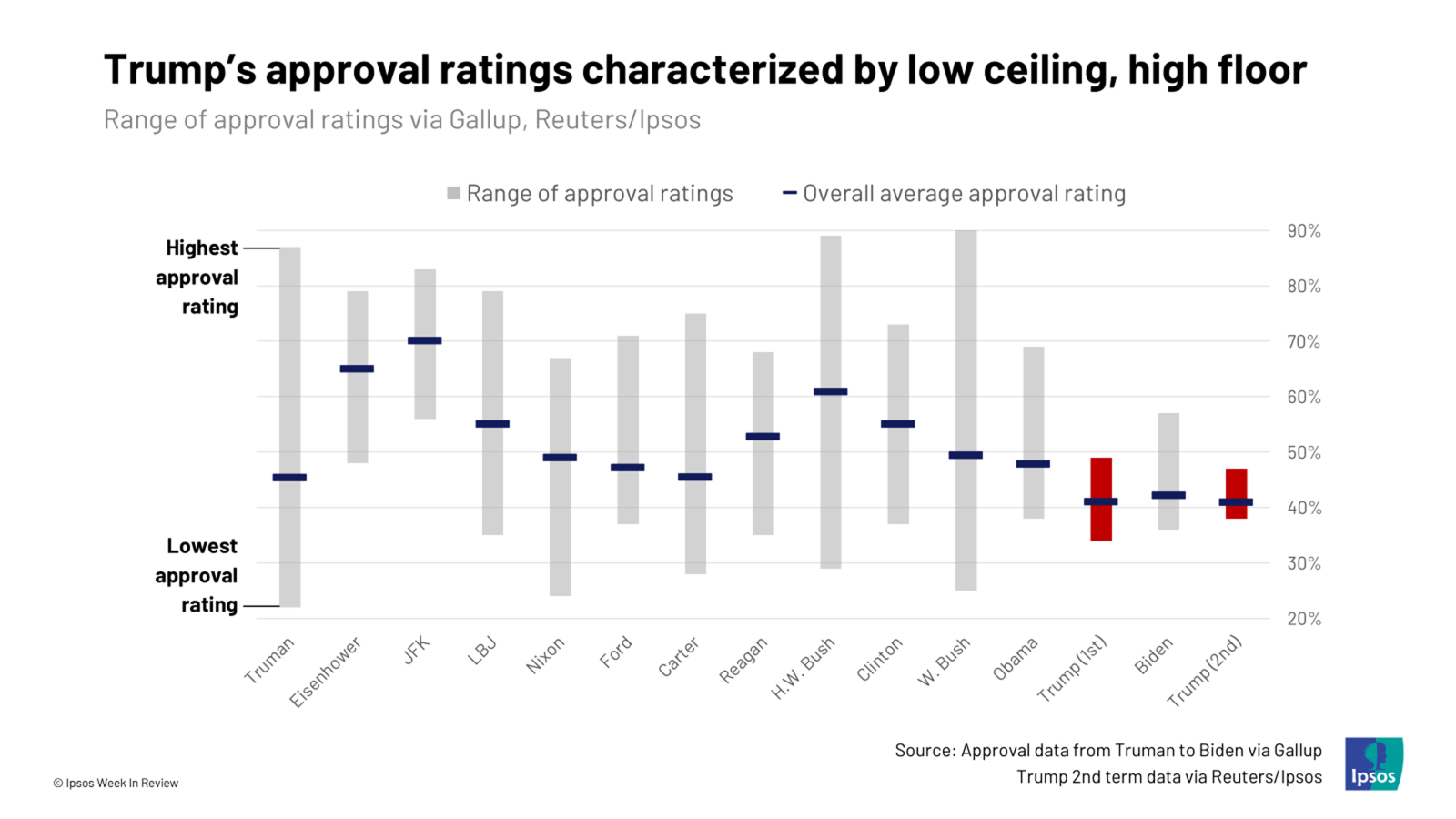 3. High floor, low ceiling. Trump’s largely stable approval rating reflects a pattern that has characterized presidential approval ratings for the past three administrations: presidents are buoyed by a loyal base but anchored by firm opposition. Right now, Trump is closer to his floor than his ceiling. Barring a seismic change in the political landscape, Trump’s approval rating will continue to hover in the low 40s and high 30s.