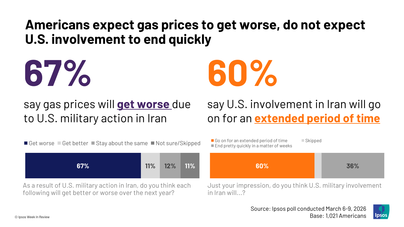 4. Is there light at the end of the tunnel? Most Americans aren’t optimistic. Roughly two in three Americans predict that gas prices will rise due to the conflict and expect the conflict to go on for an extended period of time.