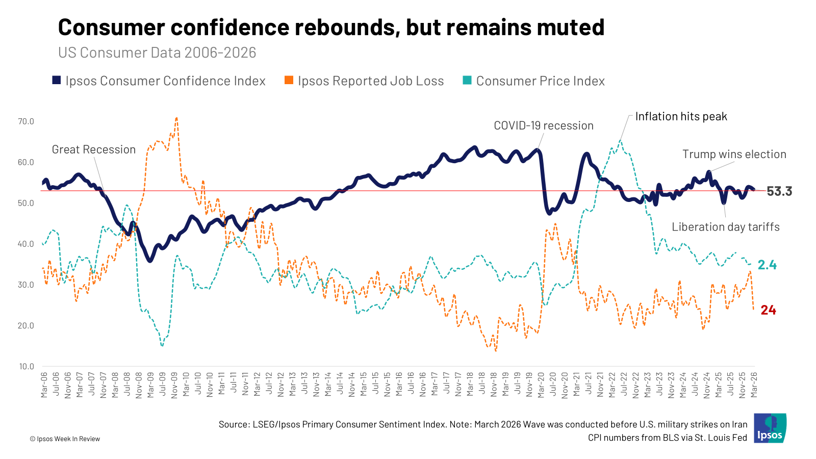 5. Consumer sentiment. If recent history is any indicator, even a modest bump in inflation could leave consumers feeling the impact for far longer: now almost two years removed from the 2022 wave of inflation, consumer sentiment remains relatively muted, especially compared to pre-pandemic levels. Further price shocks could deepen the malaise.