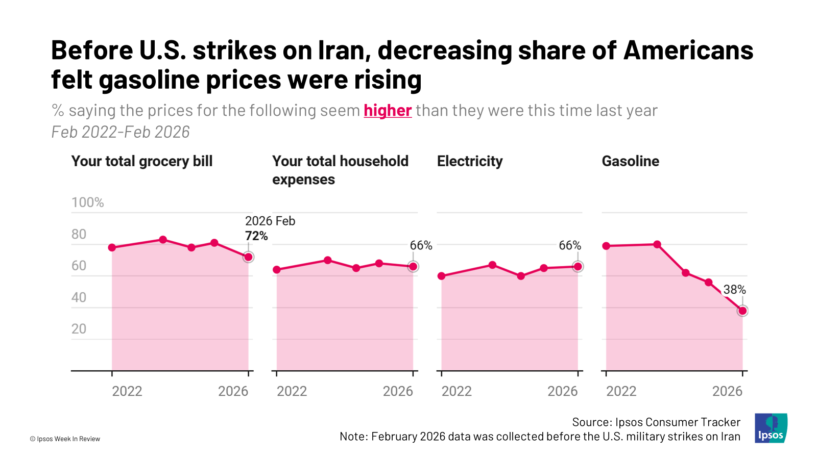 1. Before the conflict, gas prices weren’t squeezing consumers. Even though inflation is far down from its 2022 peak, consumers still say they have been experiencing price increases in their grocery bills, electricity bills, and overall household expenses. As recently as February, gas prices were a key exception to continued rising prices. Skyrocketing gas prices will change that.