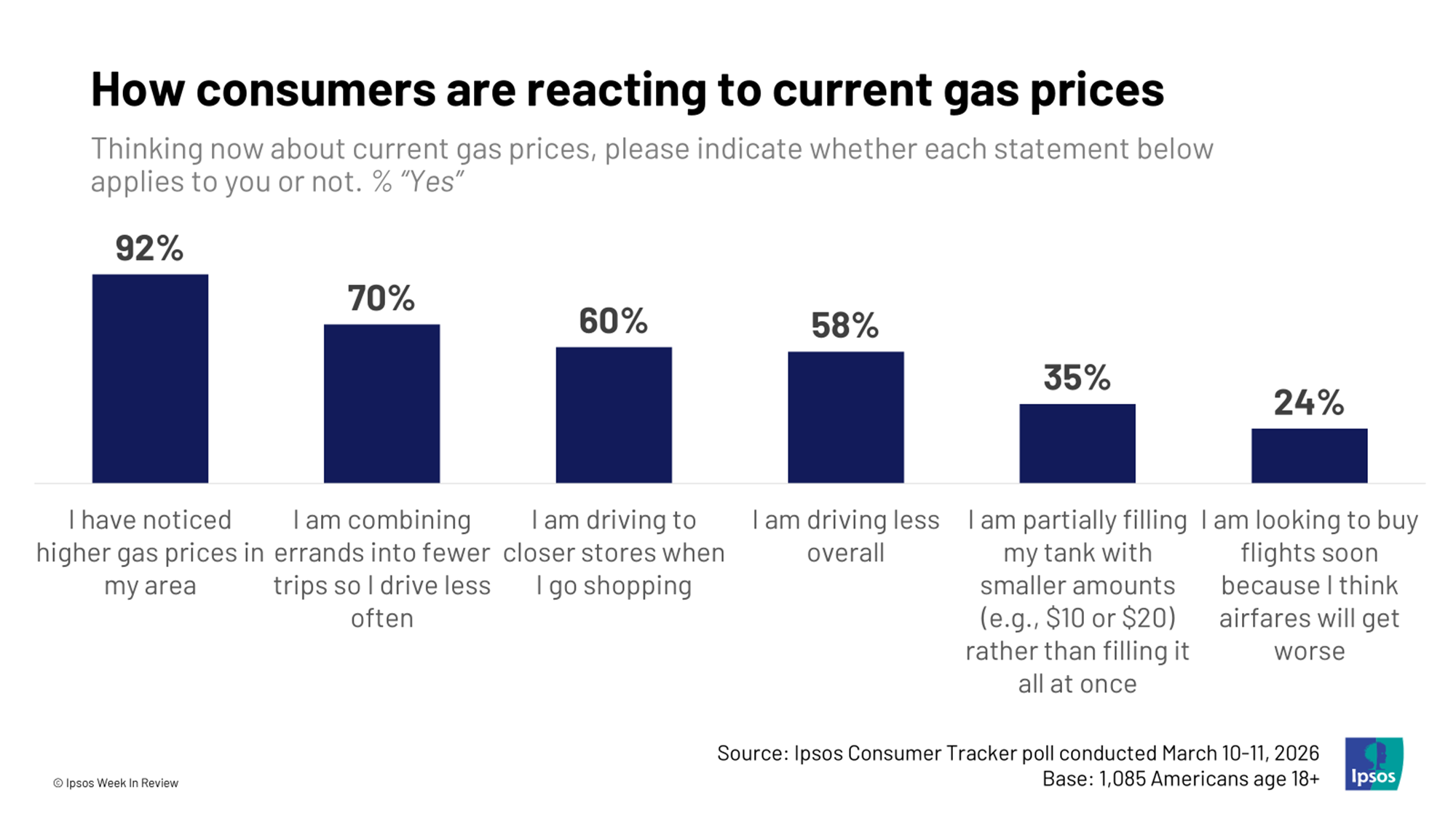 3. How consumers are dealing with gas prices. The vast majority of Americans are feeling the spike in gas prices. Over half are driving less or are changing how and where they shop to deal with current gas prices. If this shift continues, it could ripple through the broader economy. Right now, rising gas prices will just be another reason for Americans to continue tightening the belt.