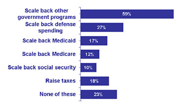 With the federal debt ceiling having been reached and Congress focused on deficit reduction, Americans remain divided over what course they want lawmakers to take. Although defense and entitlements make up the largest part of the budget, only one in four Americans (27 percent) want to see defense spending reduced and 17 percent want to see Medicaid cut. Even fewer want to cut Medicare (12 percent) or Social Security (10 percent). Only one in five (18 percent) want to see tax increases as part of a budget deal. Instead, 59 percent of Americans want Congress to cut an unspecified group of "other government programs."