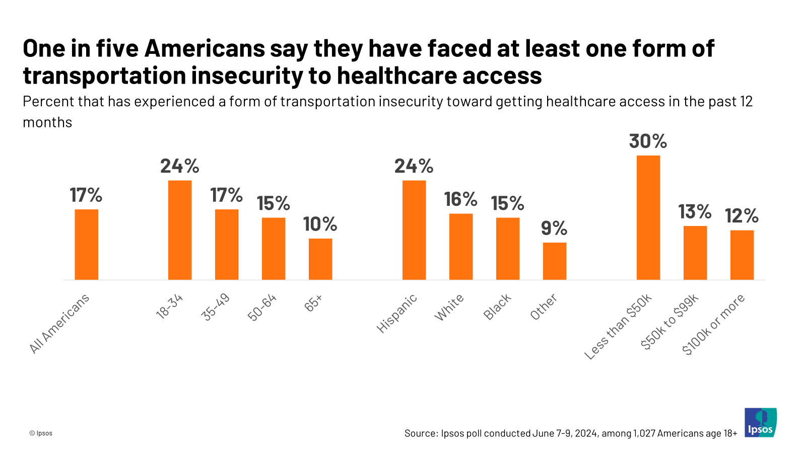 Washington DC, August 21, 2024—A new Ipsos poll finds that one in ten Americans have delayed scheduling a medical appointment because it would take them too long to get an appointment. The poll also finds that 6% of Americans say that a lack of public transportation options was a reason they delayed scheduling an appointment, while 5% cite unreliable or infrequent transportation.