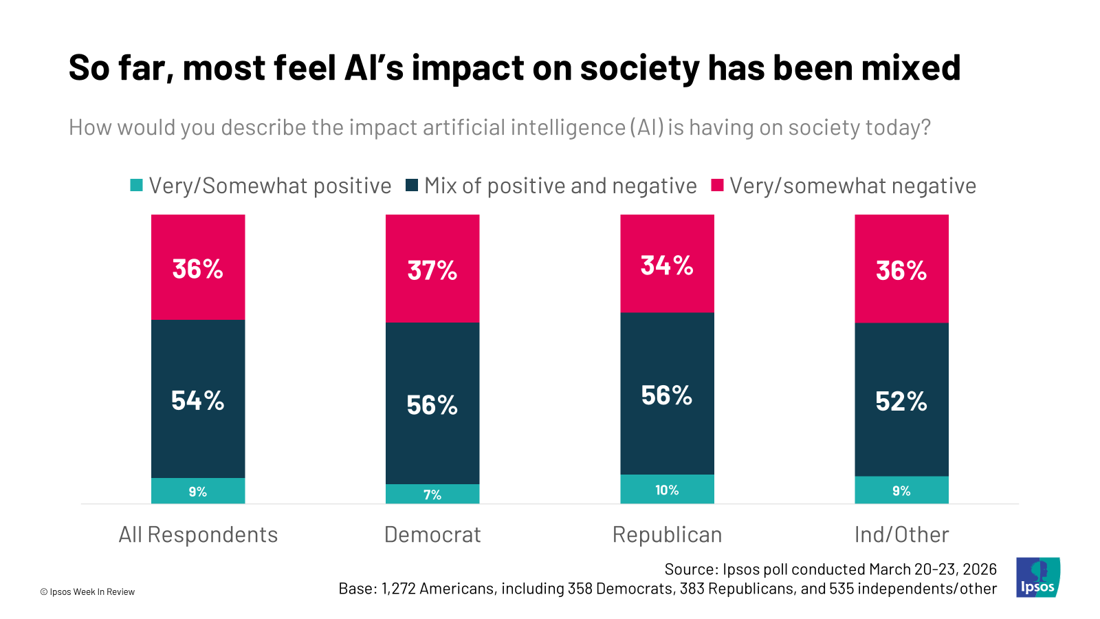 1. Mixed impact. Even if the vibe on AI leans negative, neither party's base has reached a strong verdict yet. Public opinion is still somewhat up for grabs, to be shaped by how AI ends up affecting Americans personally.