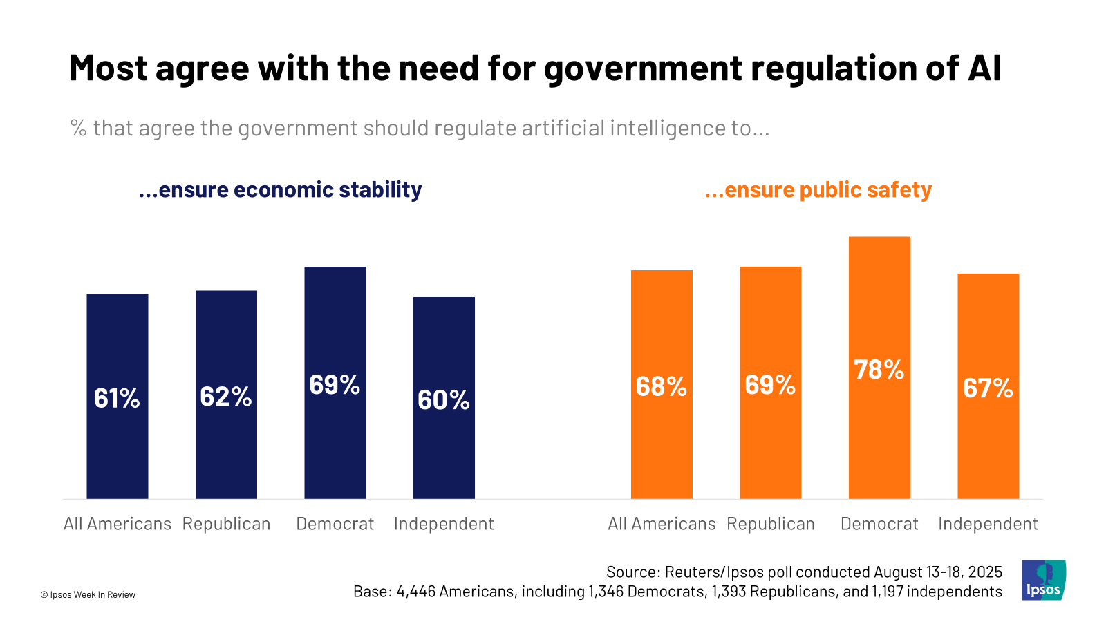 2. Bipartisan appetite for regulation. Republicans and Democrats support government regulation of AI to ensure both economic stability and public safety. In a political era defined by division, the desire for AI oversight is a rare point of common ground.