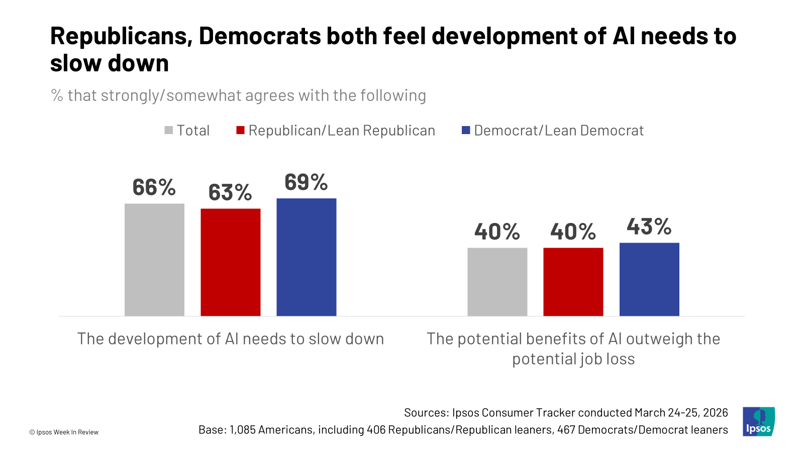 3. Both sides also favor restraint in development. Most Americans don’t align with the Silicon Valley mantra of “move fast and break things.” Instead, they favor more restraint in the development of AI and are unsure whether AI’s potential benefits will offset its impact on jobs.