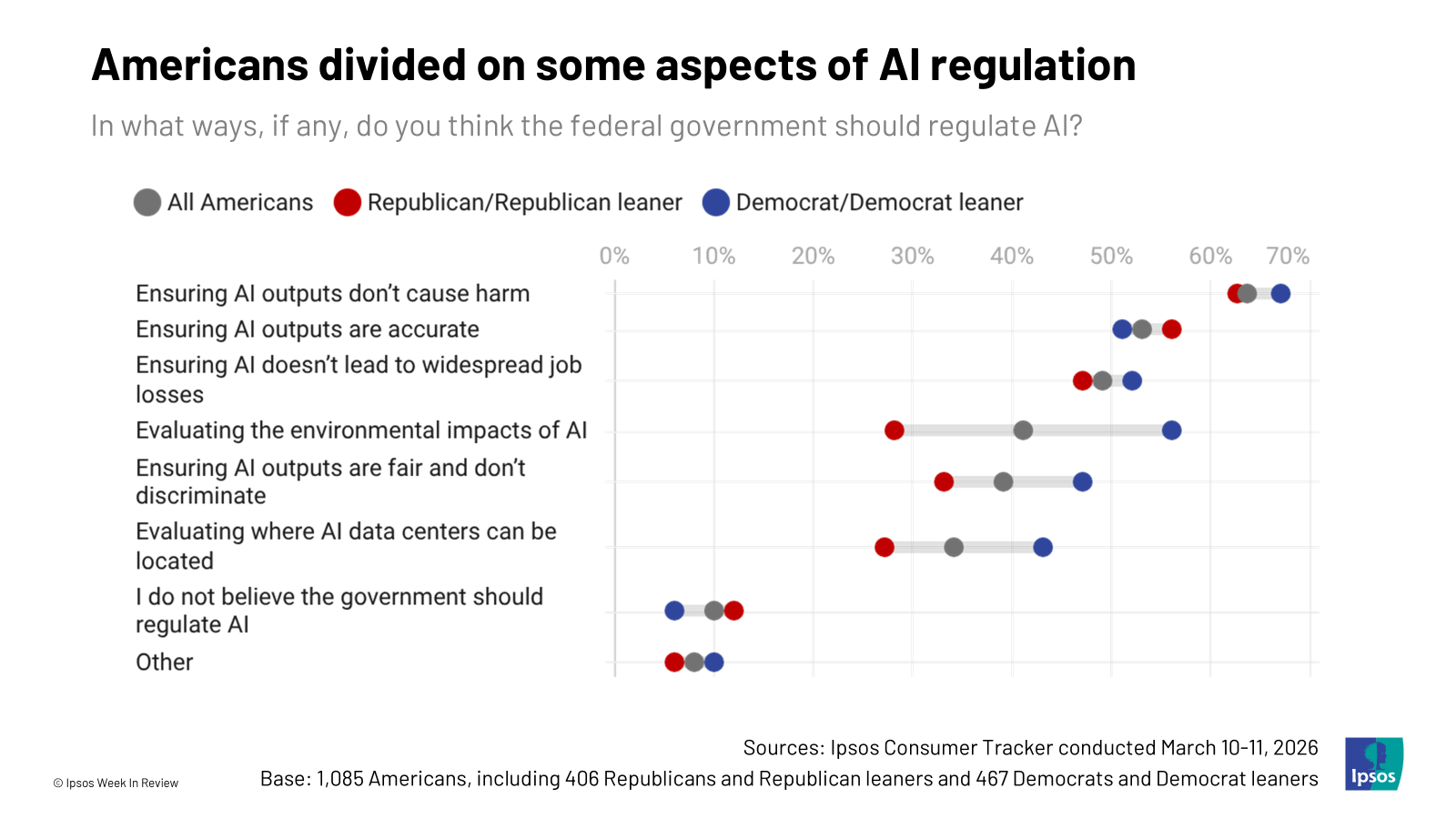 4. Where the rifts may emerge. Americans largely agree on the need for government regulation of AI. But they are more divided on some aspects of AI regulation, especially those that involve existing partisan flashpoints like combating discrimination and the environmental impact of AI.