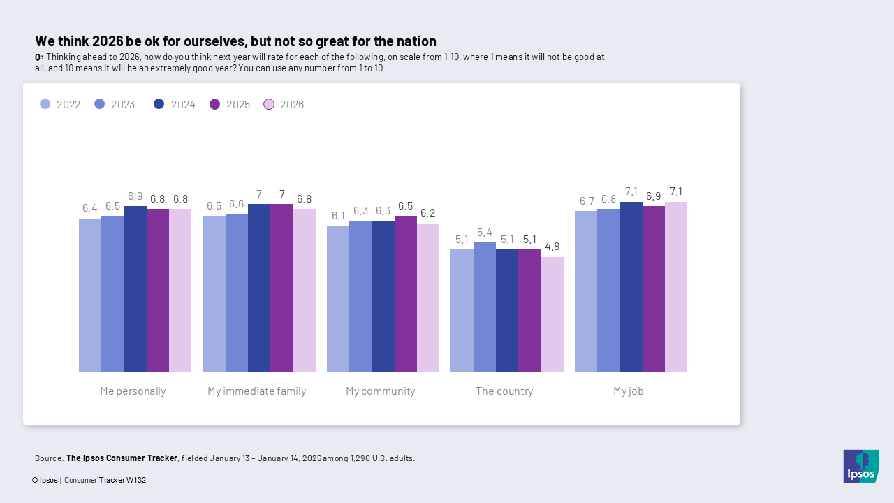 This wave we asked people to again anticipate how great the year will be. We’re once again generally optimistic. We predict 2026 will have a mean score of 6.8 for “me personally” and for “my immediate family.” A pattern we see worldwide is that optimism falls off the further from ourselves/our control we go. This follows the trend as we drop to 6.2 for our community and just 4.8 for the country. We have the most hope for our jobs at 7.1 — basically due to the fact that there is no partisan split on that.