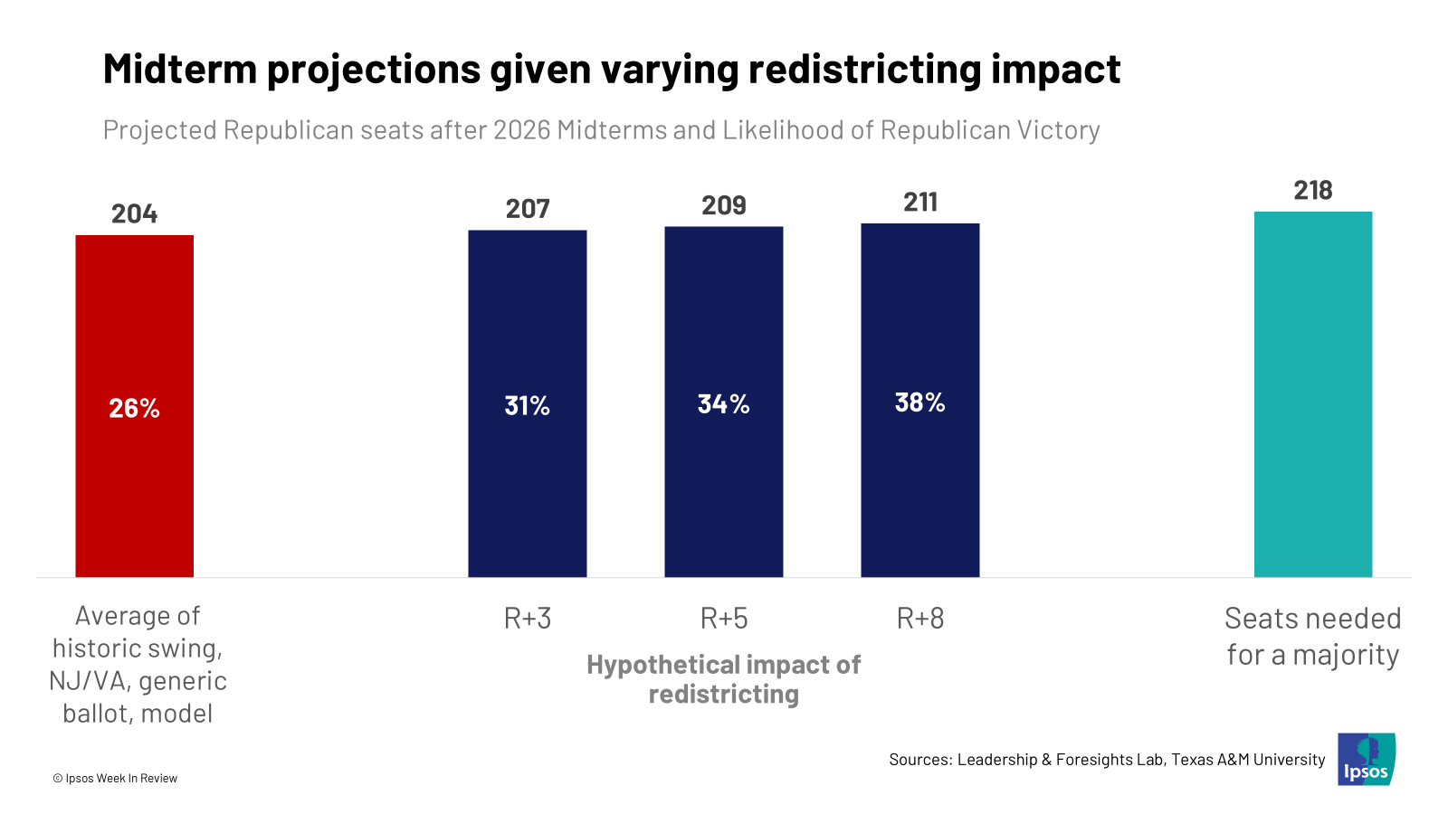4. Redistricting effect. The eventual impact of the redistricting battle remains undecided. But even in scenarios where redistricting favors Republicans between three and eight seats, the odds still don’t tilt Republican. Redistricting certainly raises the projected number of Republican seats, but the current environment still favors Democrats.