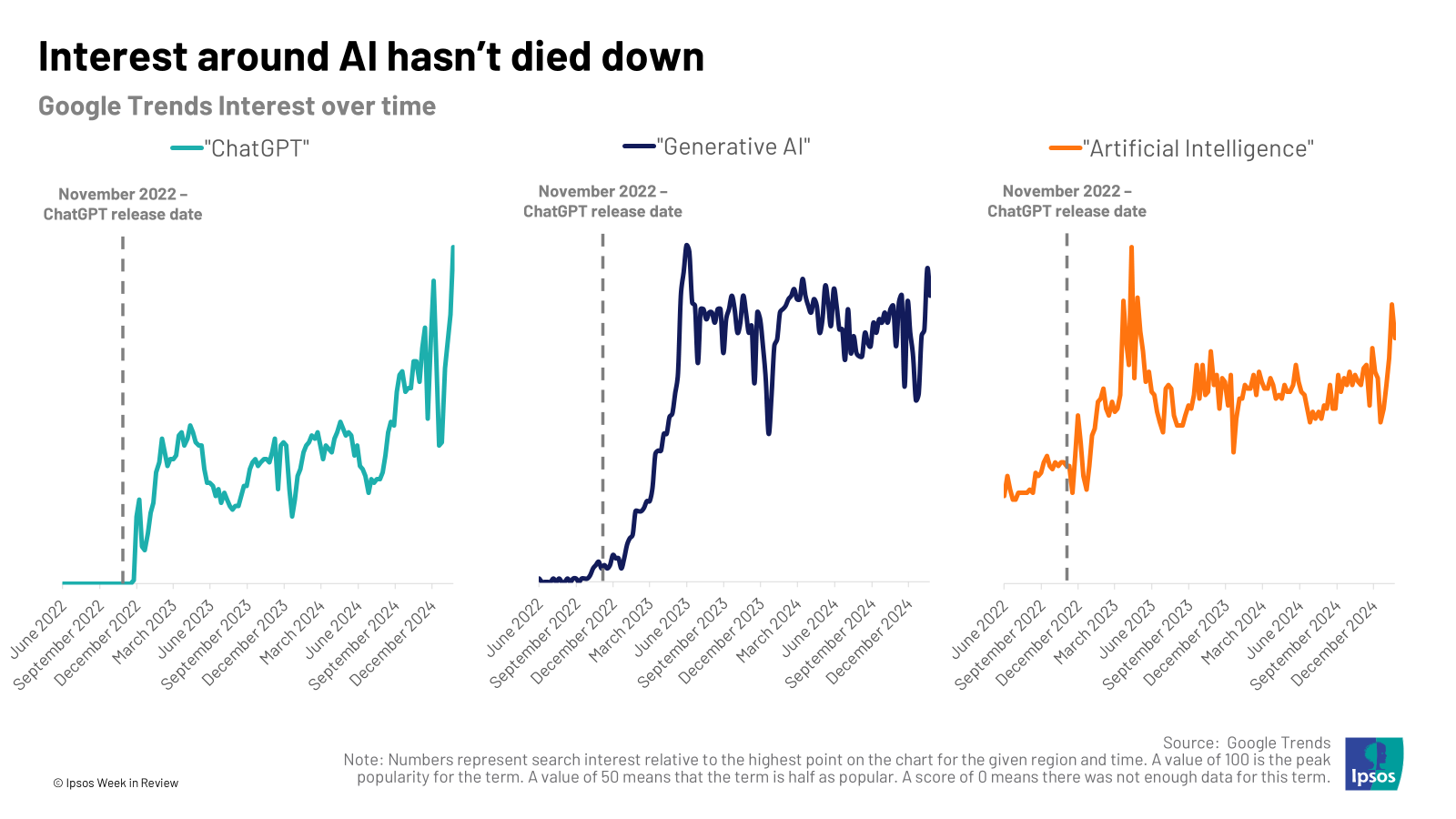 - The hype is still here. Though the most optimistic (and pessimistic) predictions of how AI could impact the world haven’t yet materialized, interest and usage of AI hasn’t faded. Unlike technologies like the metaverse, interest in AI has shown to be sustained. AI tools are here to stay.