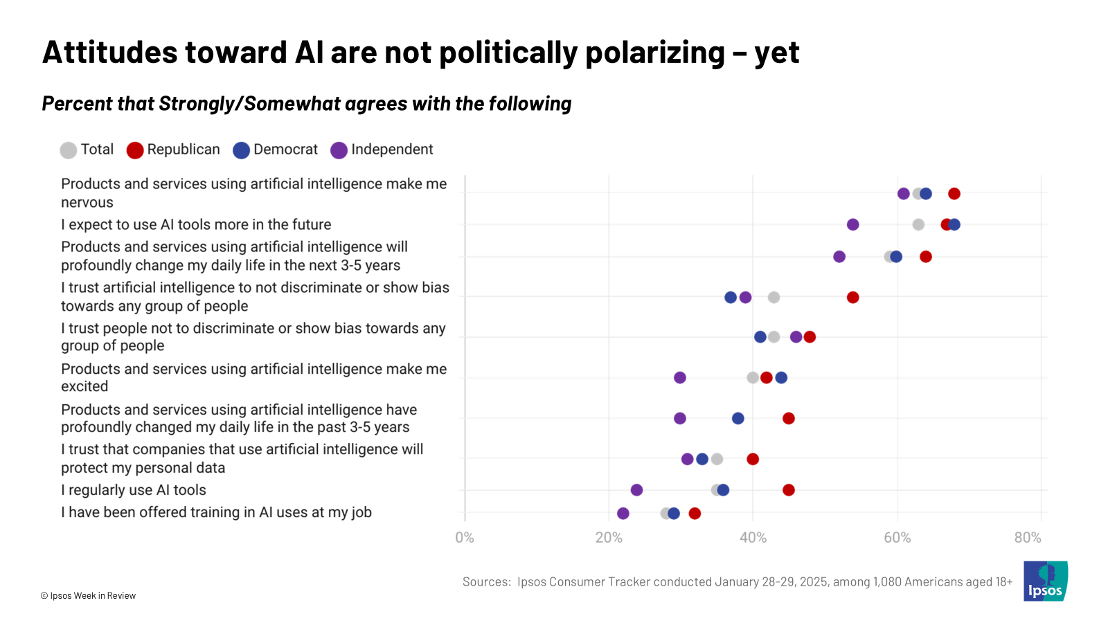 - Not a partisan flashpoint – yet. There are some slight partisan differences in attitudes toward AI regulation, but not at the same level of polarization seen on issues like immigration or political extremism. But let history be a lesson – over time, views of social media companies became polarized along party lines. If AI makes a bigger impact on Americans’ daily lives, be wary of AI becoming an issue that gets fractured across party lines.