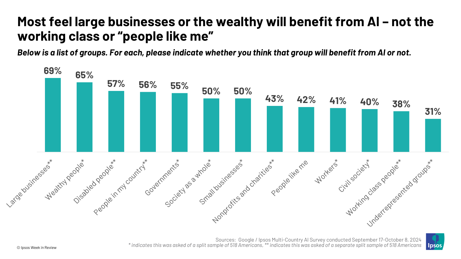 - AI populism? Americans expect elites and the wealthy to benefit from AI more so than people like themselves. Americans’ distrust of the country’s elite is already high. If AI has a significant impact on Americans’ jobs and livelihoods, don’t rule out AI becoming a key force in American domestic politics.