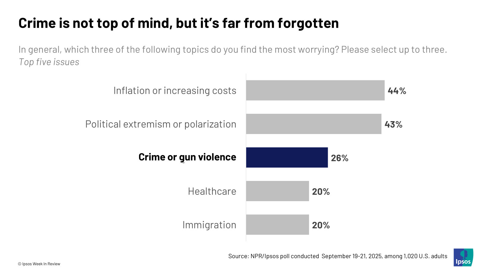1. Concern with crime. Crime has not been the issue of the second Trump administration, but it has been a major theme, sitting behind inflation and political extremism but above immigration on the list of America’s top concerns.