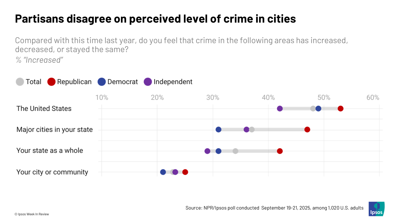 Crime, particularly in cities, is a prime example of America’s fractured realities, at least when it comes to certain topics. Partisans are in alignment on how they view crime in their local area, but not when it comes to crime in cities. This isn’t exclusive to crime. For example, perceptions of the U.S.’ economic health tends to vary among partisans based on whether their party is in power. This is a feature, not a bug, of U.S. politics.