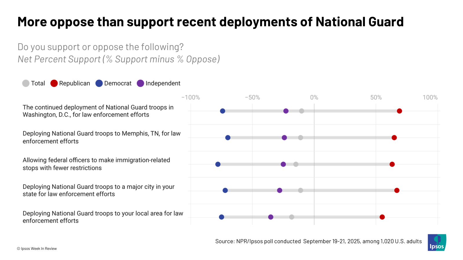 4. National Guard deployments. Even as a clear majority views the level of crime in cities as unacceptably high, support for the deployment of the National Guard is relatively low.