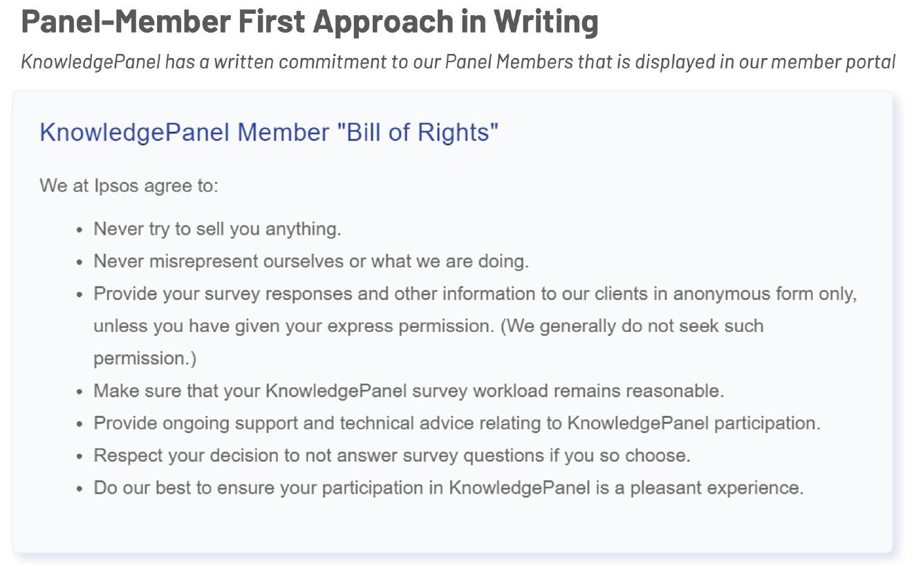 Ipsos maintains its Panel-Member First design by preventing attrition on the KnowledgePanel. A crucial way that Ipsos does this is by writing and demonstrating our values through our KnowledgePanel Member Bill of Rights, where Ipsos tells panelists what they can expect from being a part of the KnowledgePanel and what rights they are afforded. For example, Ipsos provides assurance that we will never try to sell panelists anything, misrepresent ourselves or what we are doing, keep responses anonymous unless given explicit permission to do otherwise, and make sure workload is reasonable, among other rights.