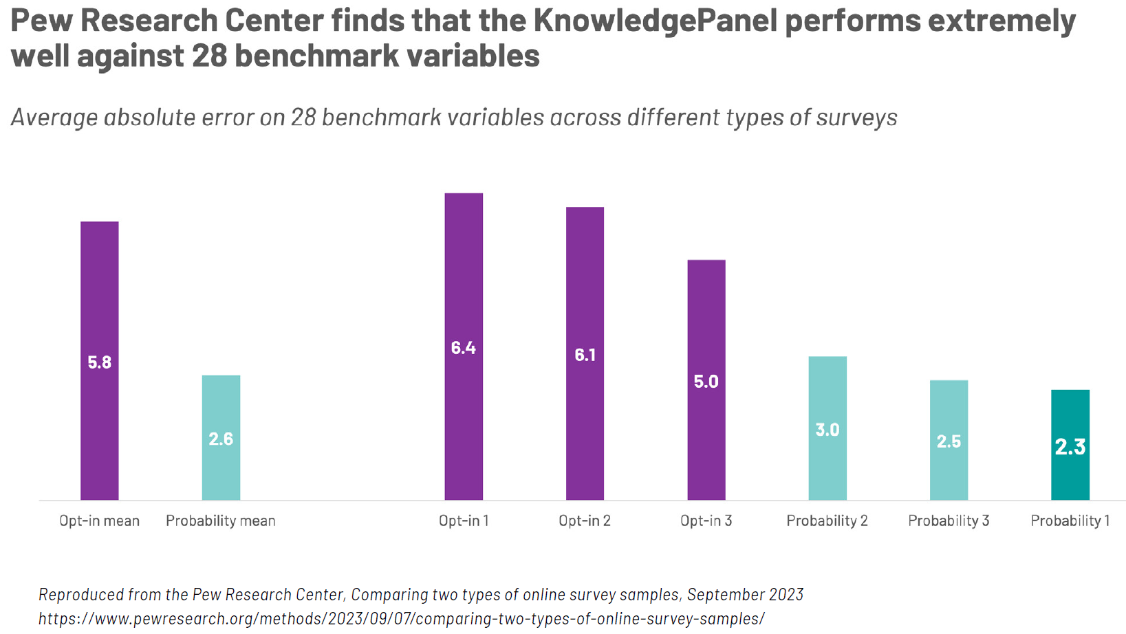 Pew Research Center also compared the KnowledgePanel to other probability and non-probability sample sources, comparing absolute error on 28 different benchmark variables. KnowledgePanel performed extremely well, a testament to how consistently KnowledgePanel performs in terms of data accuracy against a wide variety of benchmarks relative other survey vehicles.