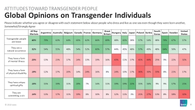 Los españoles, los más tolerantes e integradores ante las personas transgénero. Lideramos el ranking mundial en la mayoría de aspectos analizados en el estudio en cuanto al acceso a intervenciones quirúrgicas para que su identidad de género se corresponda con su realidad, que puedan servir en las Fuerzas Armadas y que puedan concebir y dar a luz a niños, si biológicamente están capacitados para ello.