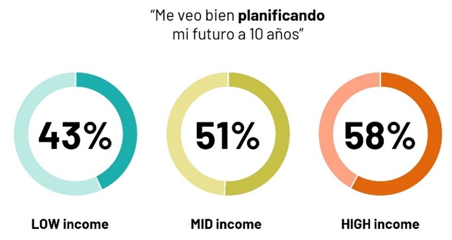 Casi el 80% de los hogares de menores ingresos atraviesa dificultades financieras o vive con lo justo, sin capacidad de ahorrar o afrontar imprevistos. La inflación y los problemas de empleo les preocupan, llevándolos a tener una mirada negativa del futuro cercano. Se trata de personas que, ante las perspectivas negativas y la imposibilidad de planificación, tienden a enfocarse en el presente.