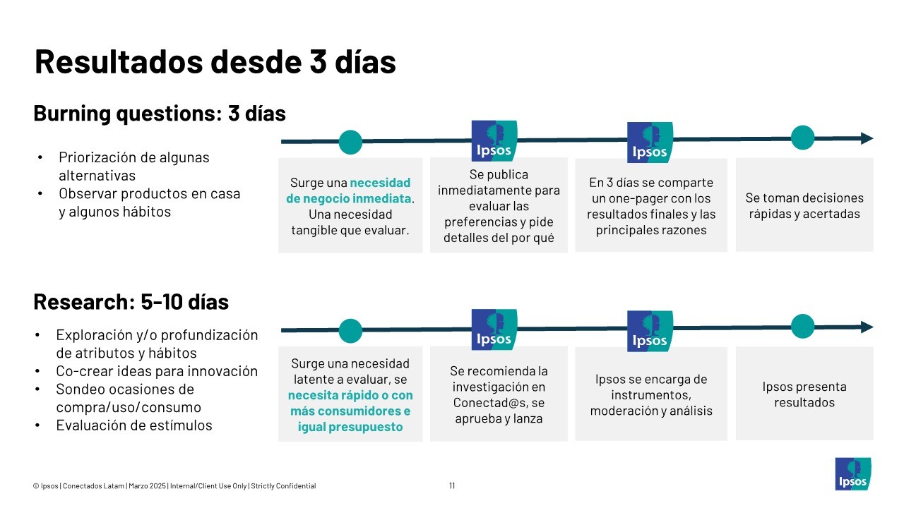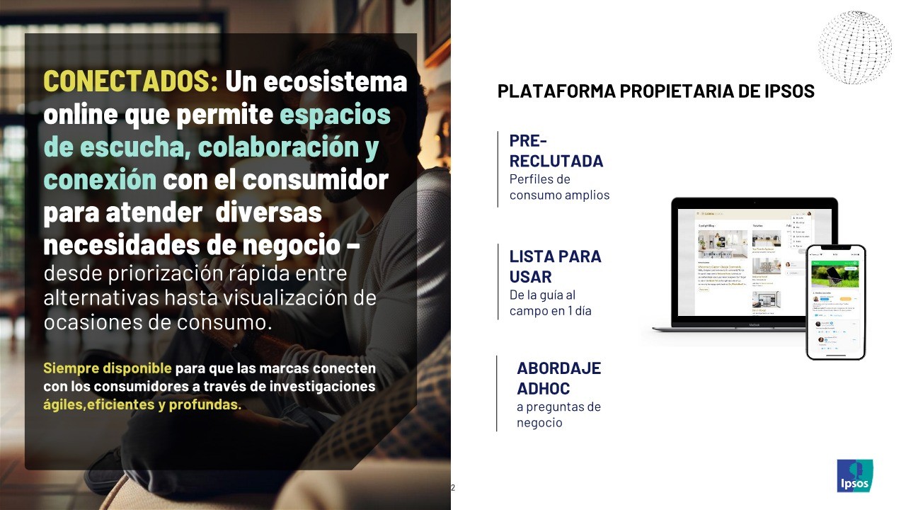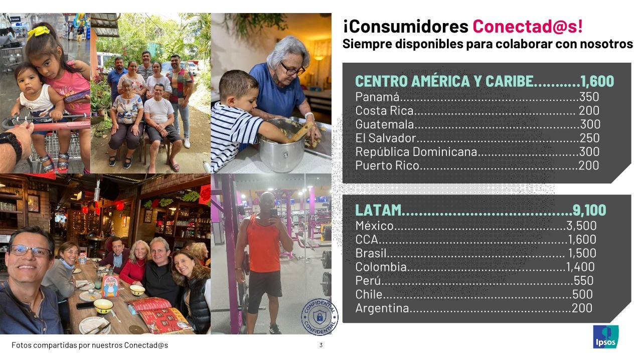 CONECTADOS LATAM: Un ecosistema online listo para usar con consumidores pre reclutados que permite espacios de escucha, colaboración y conexión para atender diversas necesidades de negocio (desde priorización rápida entre alternativas hasta visualización de ocasiones de consumo, entre otros) en: Panamá, Guatemala, El Salvador, Costa Rica, Puerto Rico, República Dominicana, México, Brasil, Colombia, Perú, Argentina y/o Chile. Siempre disponible para que las marcas conecten con los consumidores a través de investigaciones ágiles, eficientes y profundas.