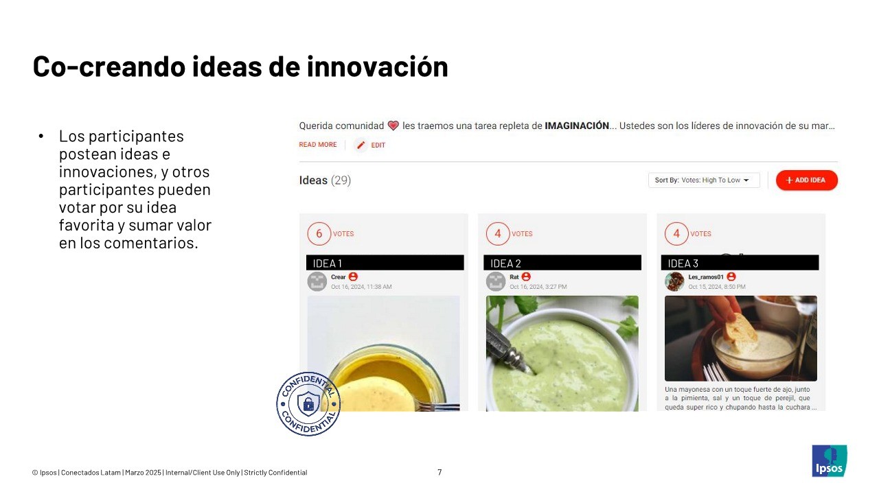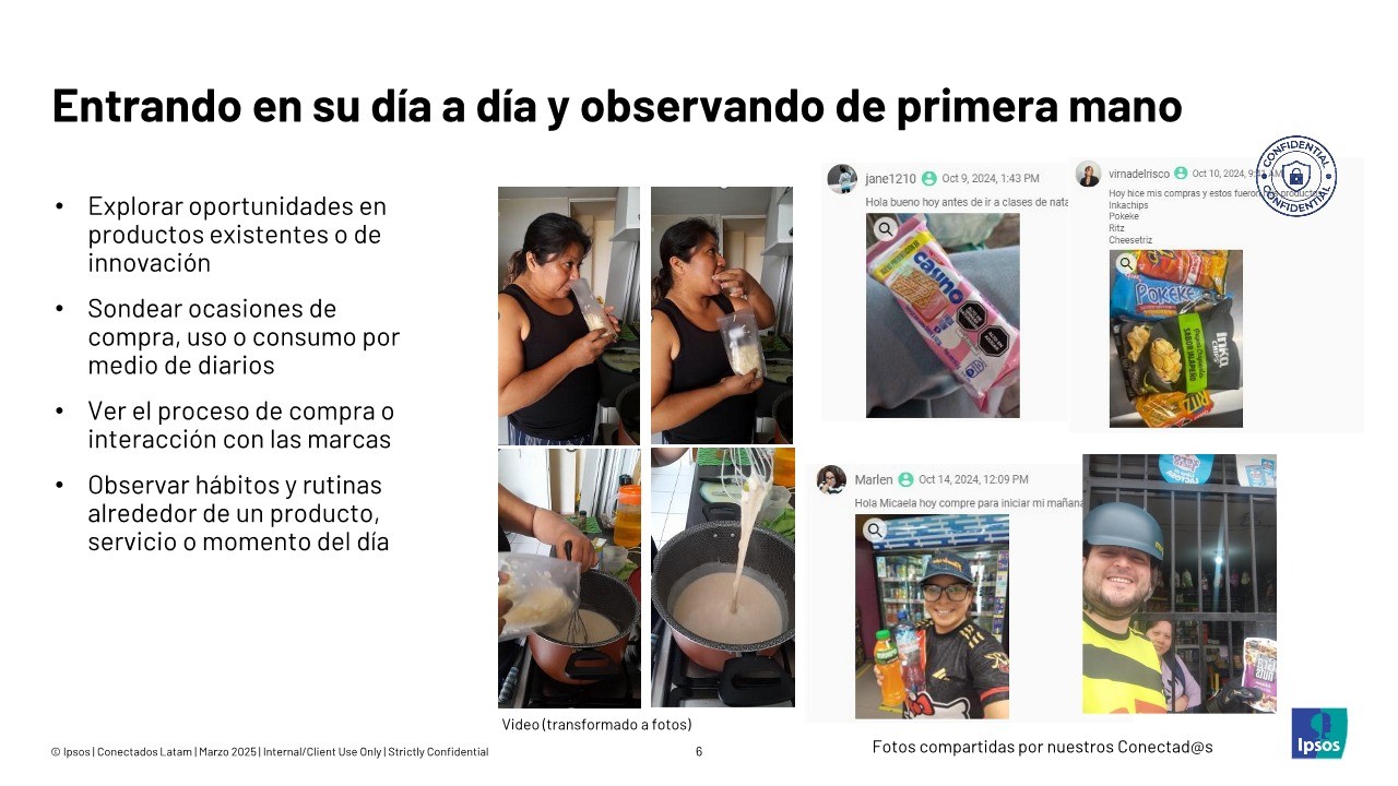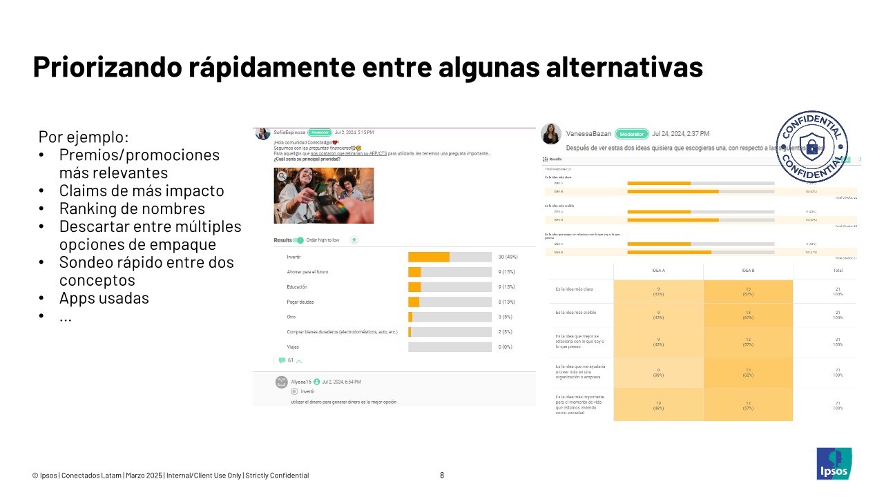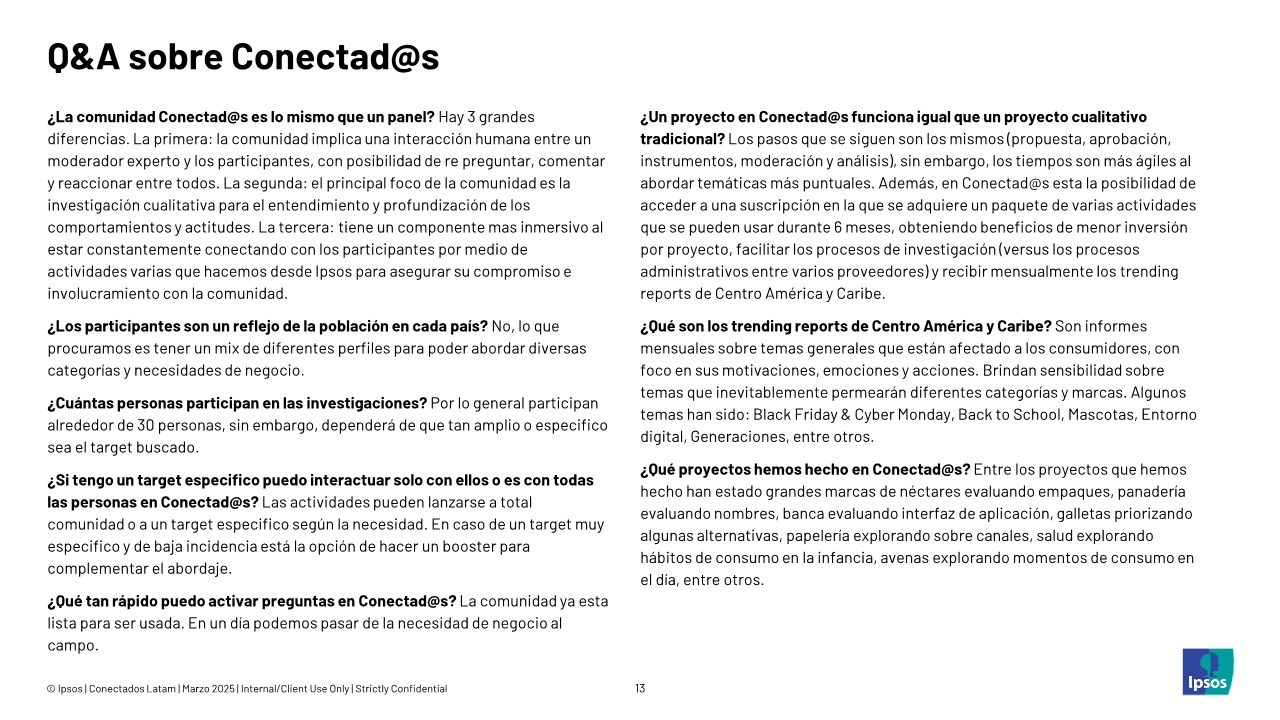 CONECTADOS LATAM: Un ecosistema online listo para usar con consumidores pre reclutados que permite espacios de escucha, colaboración y conexión para atender diversas necesidades de negocio (desde priorización rápida entre alternativas hasta visualización de ocasiones de consumo, entre otros) en: Panamá, Guatemala, El Salvador, Costa Rica, Puerto Rico, República Dominicana, México, Brasil, Colombia, Perú, Argentina y/o Chile. Siempre disponible para que las marcas conecten con los consumidores a través de investigaciones ágiles, eficientes y profundas.