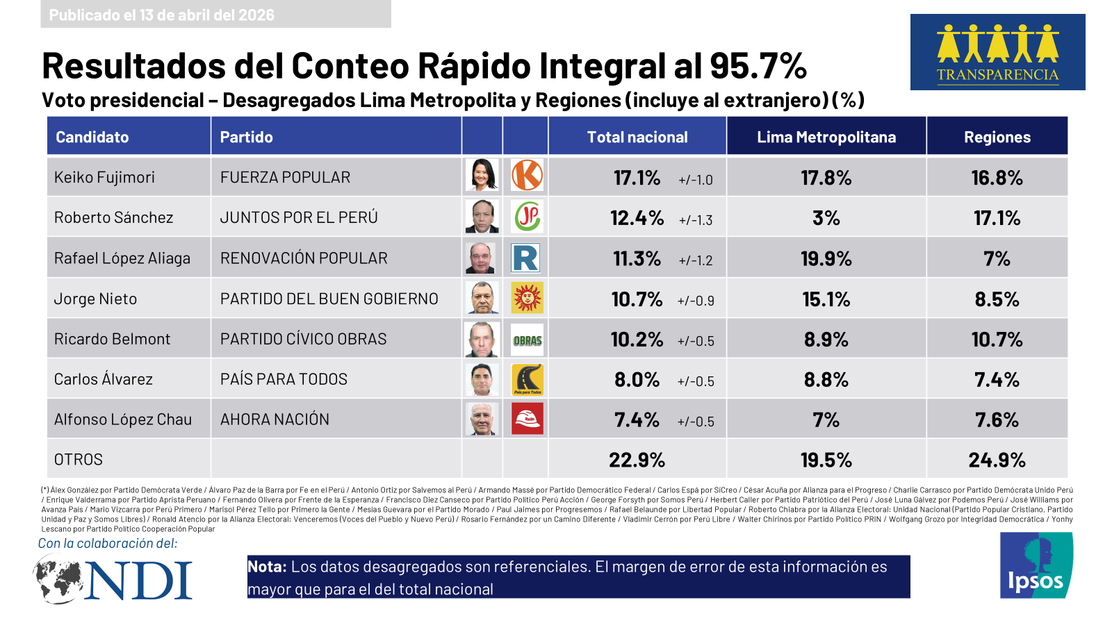 Conteo Rápido Presidencial 2026, al 95.7%, realizado por Ipsos Perú por encargo de Transparencia, con la colaboración del National Democratic Institute (NDI)